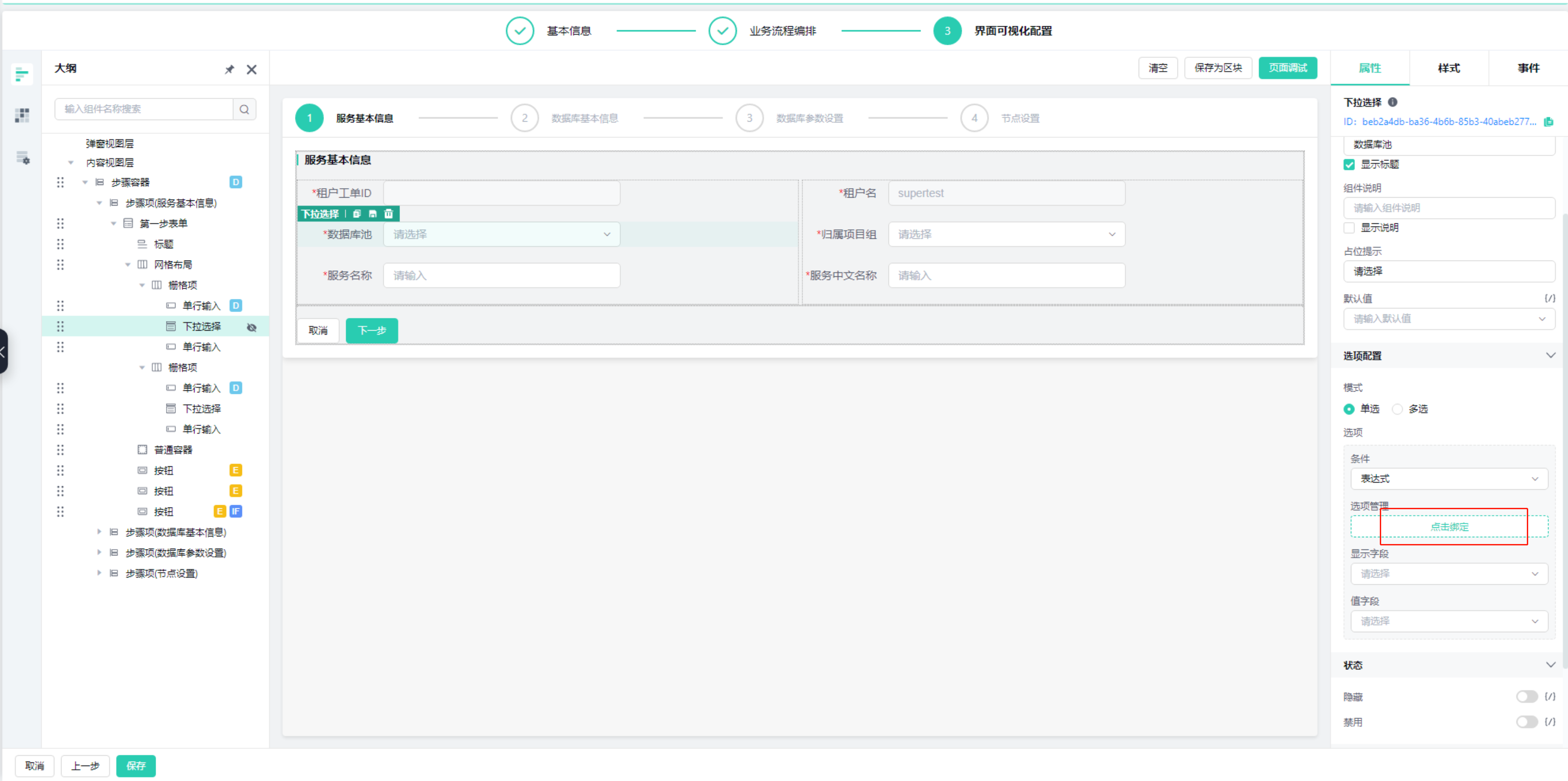 选中后,在属性面板中配置下拉选项,点击【点击绑定】。