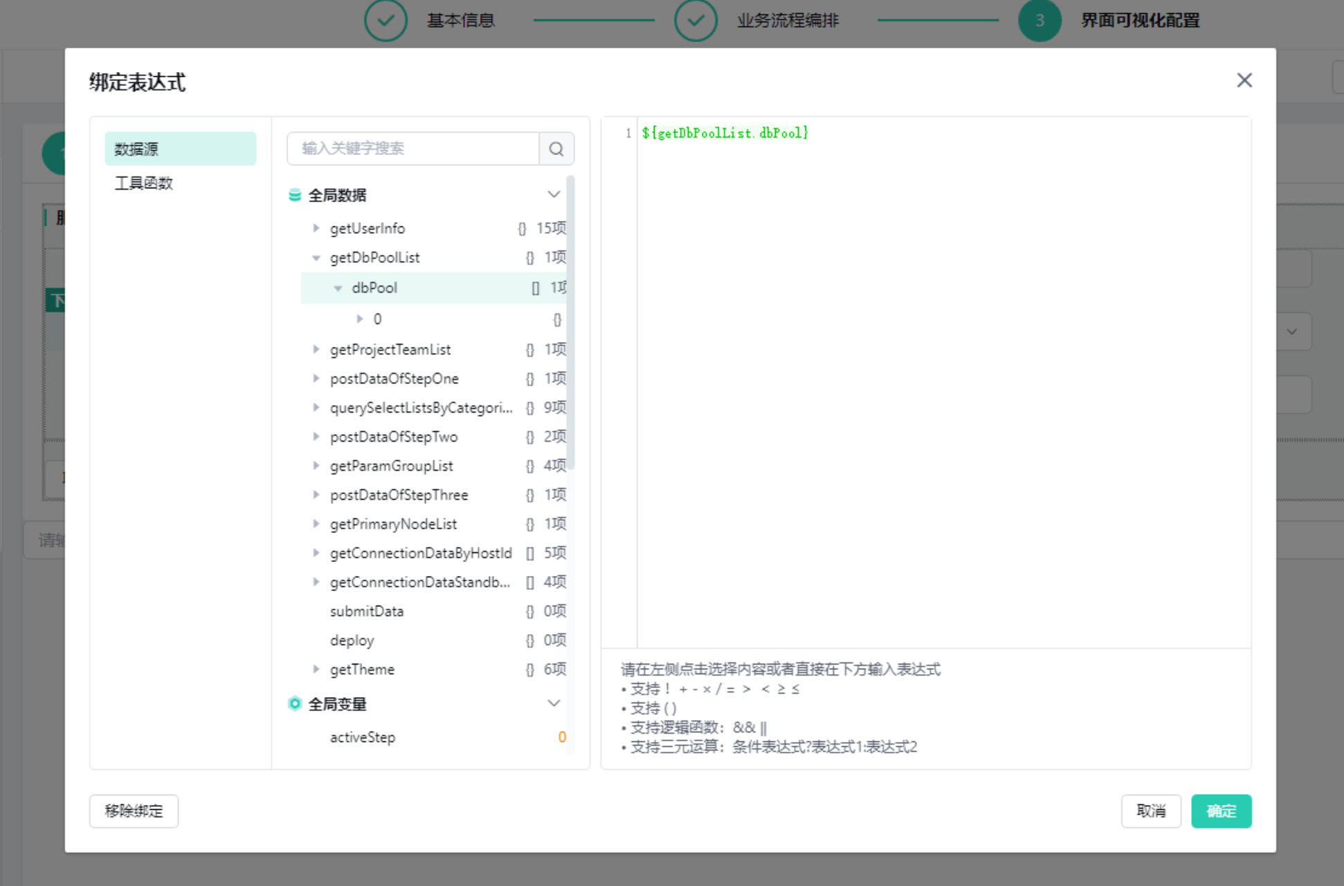 当我们在配置界面可视化的时候,经常会遇到一个场景:想要动态设置某个地方的标题、值、表格数据等显示。这时候就需要动态绑定表达式,让页面上显示预期的数据,本篇文章讲的就是该功能的配置及应用。