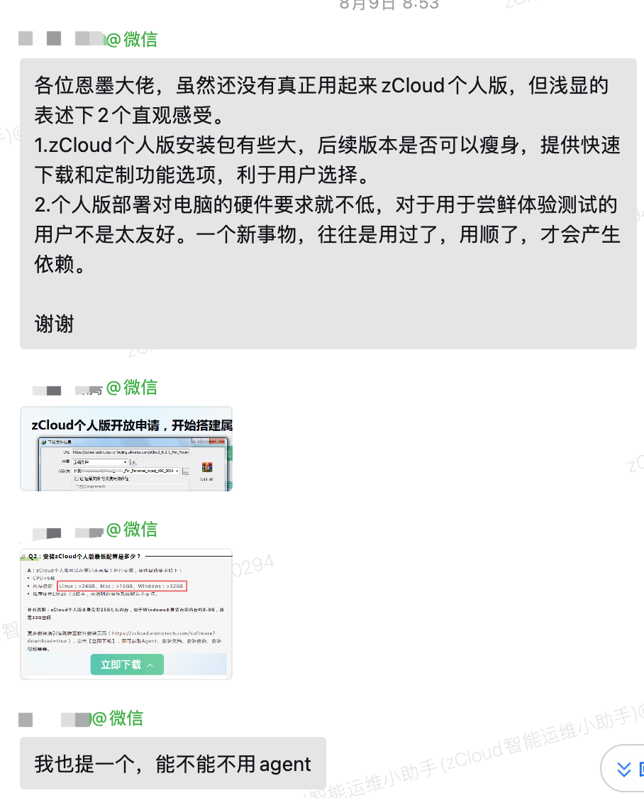 针对大家在使用中“吐槽”较多的内存资源占用多的情况,我们的zCloud研发团队经过日夜奋战,在功能不打折的情况下,成功将内存资源优化至16G的硬件配置即可运行!
