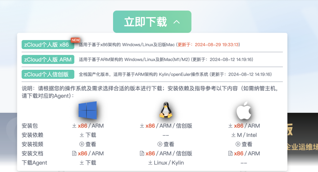 Linux版文档:新增Linux 8.x操作系统yum安装Docker命令 Windows版文档:新增16G内存操作系统安装部署zCloud个人版参数调优配置 Linux/Mac/Windows版文档:新增快速纳管自身MySQL数据库样例说明