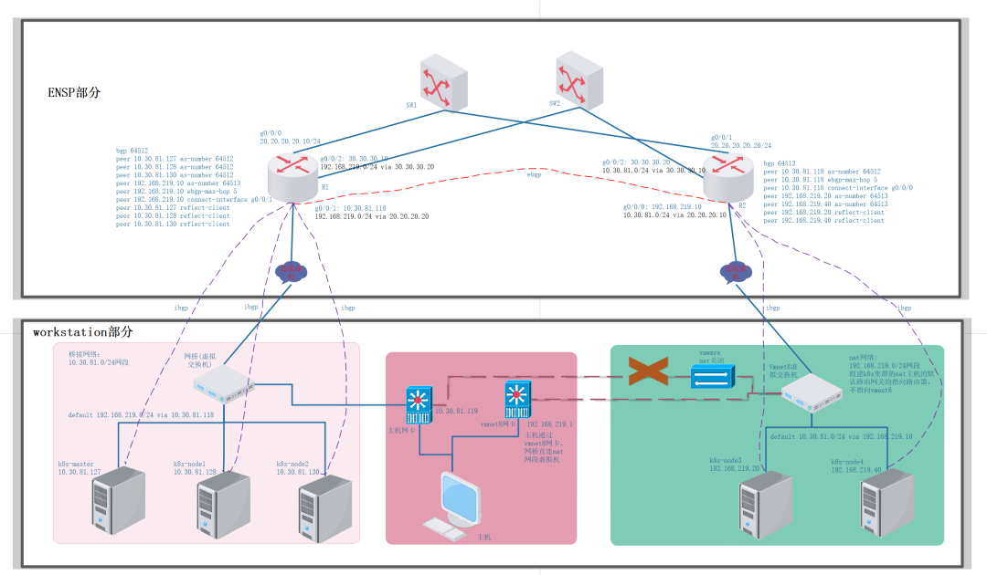 之前详细介绍了calico的ipip、vxlan、bgp模式, 但是所有的k8s节点都是同网段的, 本篇使用ensp和workstation在自己家里就可以模拟测试跨网段k8s集群calico方案的纯bgp模式。