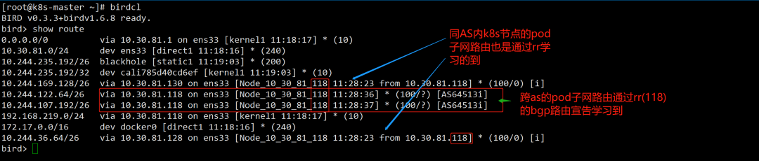 在bird客户端看看学习到的bgp路由, 在k8s-master节点上操作, 其自身pod子网段为:10.244.235.192/26