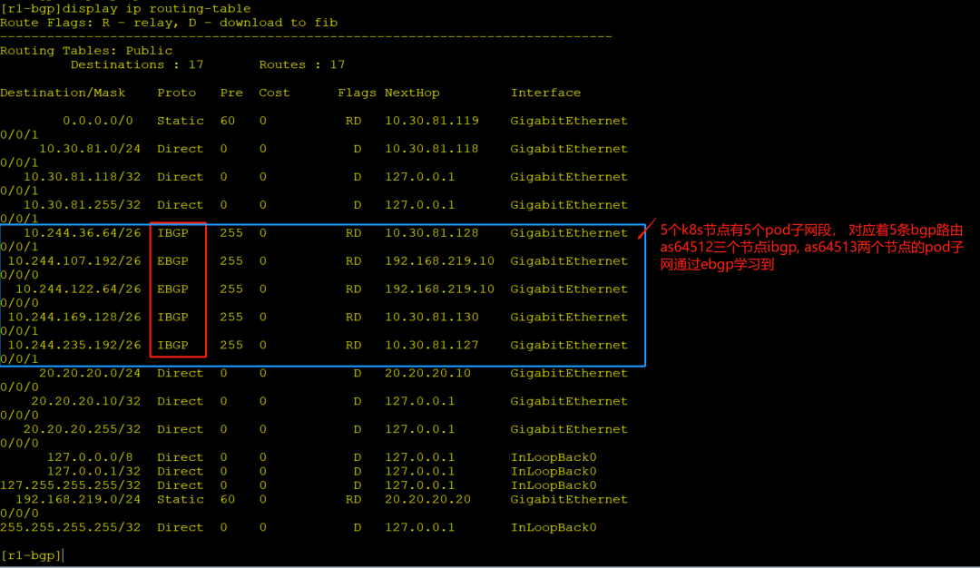 在ensp网络的R1上其应该能学习到所有k8s节点的pod子网对应的子网段路由