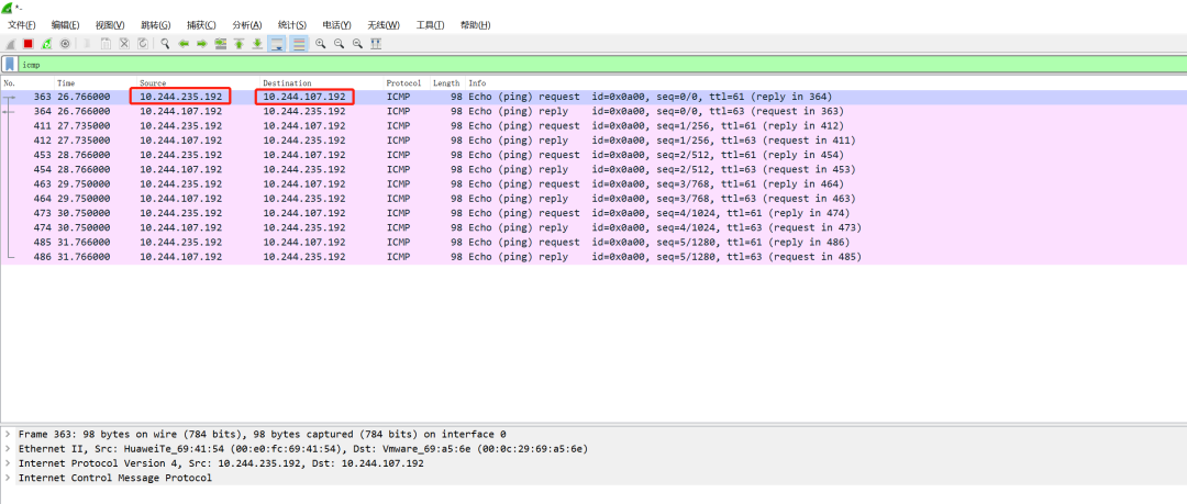 接着通过跨网段节点的pod间通信抓包验证, as64512的k8s-master节点的pod master与as64513的k8s-node3的pod node3间通信抓包, 在R2上抓包