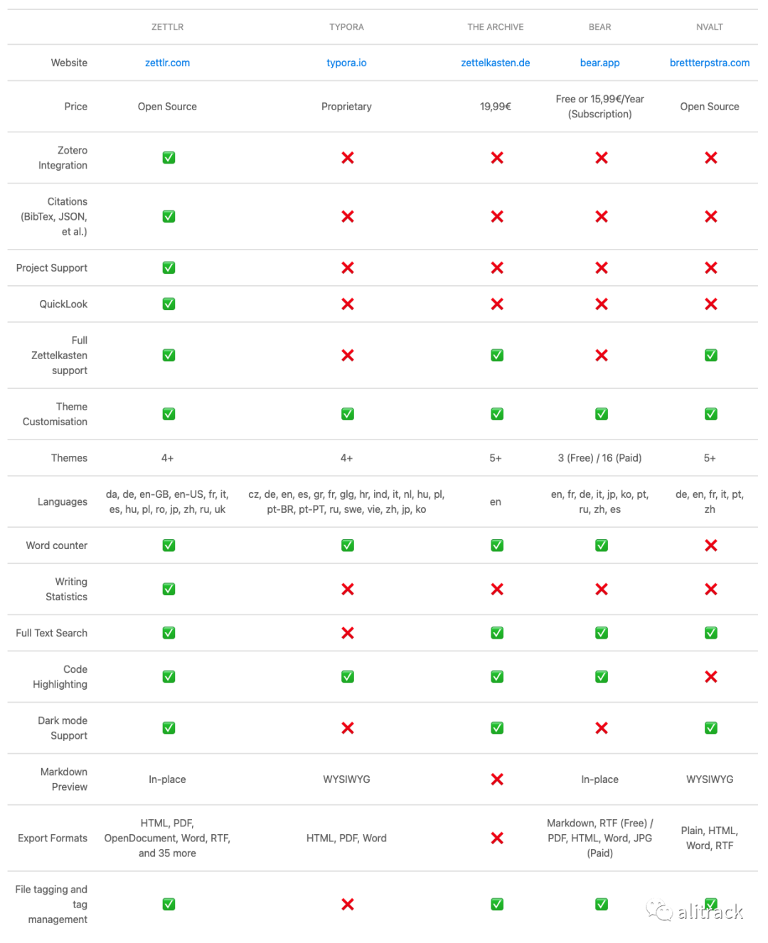 另外推荐试试Zettlr(https://www.zettlr.com/),这个支持苹果的 M1 芯片,中文和其他更多的功能特点,比如多语言支持,文末附个夸张的对比图,也许看完这个图,你转而爱上了Zettlr也不一定。