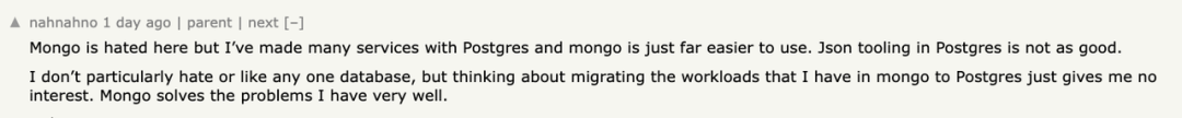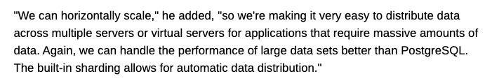 有点拳打 PostgreSQL,脚踢 Elasticsearch 的意思。接着又说道:"That technology has been around a long time," he said. "They're really the beneficiary of lift and shift from Oracle, SQL Server, and MySQL, so they're kind of consolidating the relational market. In terms of why do we compete or why do we win… MongoDB has a very flexible schema allowing you to store documents in a JSON-like format. This is beneficial for application structures that evolve over time."「这种技术已经存在了很长时间,」他说。「他们确实是 Oracle、SQL Server 和 MySQL 优化的受益者,因此他们正在整合关系型市场。至于我们为什么要竞争,为什么要取胜…… MongoDB 的模式非常灵活,允许你以类似 JSON 的格式存储文档。这对随时间演变的应用结构非常有利。」按照 MongoDB CEO 的说法,PostgreSQL 是 Oracle, SQL Server 和 MySQL 平替的受益者,正在统一关系型数据库的市场。而 MongoDB 的优势是灵活的 Schema。当然这个话,PostgreSQL 的支持者是不买账的,就像这个 HN 用户的留言:相比于 Schema 是否足够灵活的争议点,MongoDB CEO 提到的水平扩展能力,确实是原生 PostgreSQL 并不具备的:对于像博彩网站这样数据处理量大,但又不差钱的团队,MongoDB 提供的整套商业化解决方案确实很有竞争力。