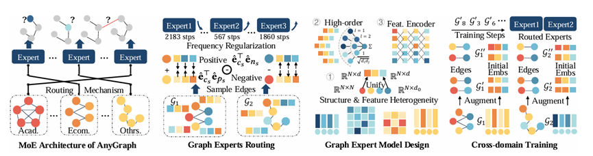 Law。AnyGraph框架是一个高效且有效的图基础模型,专为应对不同图数据集中结构和特征异质性的多方面挑战而设计。AnyGraph采用创新性的专家混合(MoE)架构,并结合动态专家路由机制,使其在跨域泛化能力方面达到了最先进的水平。在38 个不同的图数据集上进行的广泛实验不仅突显了AnyGraph 在零样本学习性能上的卓越表现,还证明了其对分布偏移的鲁棒性以及其遵循规模定律的能力,从而随着模型大小和数据量的增加而提高了预测精度。该模型在训练和推理效率上的表现,通过与现有方法的比较得到了验证,进一步巩固了其实际应用性。