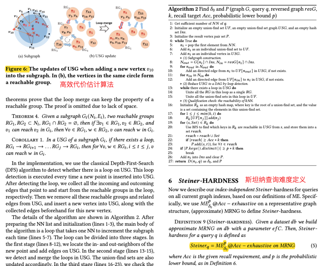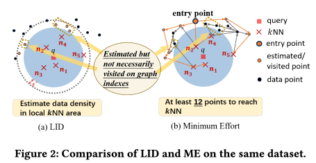 论文概述 图索引是当前向量数据库中普遍认为查询性能最好的索引算法之一。然而最近部分研究发现,图索引的性能在不同查询上并不稳定,即在某些“简单”查询上召回高,查询快;但在“较难”查询上召回不达标,查询速度也更慢。 如下图,在Deep1M数据集上,要想让所有查询达到90%@50召回,大部分简单查询只需要访问不到1000条向量,而少部分难查询需要访问10000向量以上。这样的性能差距会导致在实际使用时,尽管设置了同样的搜索参数,仍然会有一部分查询精度低、速度慢。 这就引出了一个问题,如何在图索引上分辨出简单和困难查询?此前常用的方法是使用局部本征维数LID,然而论文实验证实,LID与实际查询难度相关系数并不高(见下图)。 其原因在于LID是基于kNN区域距离分布的,但是图索引中存在长边,距离近的点可以不访问(见下图褐色矩形中的点)。因此,论文基于图索引的结构特性,探讨了基于图论查询的代价分析方法、并以此设计了查询难度的定义方法,即斯坦纳难度。 从图1中可以看出,目前公开数据集上的大部分查询都是简单查询,使用这种查询负载,难查询的性能很难被观察到,给索引的上线使用带来了隐患。因此,论文设计了均匀包含各种查询难度的向量索引压测负载,并对近年来的最新图索引重新做了评测。 论文结果显示,斯坦纳难度与实际查询代价的相关系数平均在0.8以上,远高于LID。在压测负载上的benchmark结果显示,HNSW,NSG至今仍然是在大部分场景下性能最好的索引结构。 关键算法 最小查询代价分析 论文首先分析了在给定一个图索引的情况下,返回一个满足召回精度条件的查询结果所需的最小代价 是多少。这里的最小意味着不限制查询算法、不限制返回哪些最近邻结果。这一最小代价是图索引查询性能的上确界。 论文随后证明,当召回为1时,这一最小代价实际上等价于在图上以任意点为起点,以knn为终点的最小斯坦纳树问题(无权图)。当召回小于1时,则斯坦纳树的终点有多种组合可能,最小代价则是这些组合中代价最小的一个。 实际查询代价估计 尽管最小代价有着良好的界限性质,但现在使用的贪婪查询算法(有时也称为集束搜索beam search),距离最优查询算法还有不小的距离。要想估计贪婪算法的查询代价,需要在最小代价的分析中加入一些限制。具体包括: 入口点:全局最优的入口点很难找到,但最近邻之一有很多快捷的方法可以得到。因此首个限制要求入口点仅能在knn中选择一个。 搜索范围:贪婪搜索会放弃在搜索过程中距离查询较远的点,尽管这些点有可能通往一条到达最近邻的捷径。因此,第二个限制要求拒绝斯坦纳树算法访问距离查询过远的邻居。 决策代价:对于贪婪搜索算法,查询中的每一步都需要访问上一步的所有邻居,论文将其称之为决策代价。第三个限制要求将斯坦纳树路径上所有点的邻居也纳入代价中。 在这三条限制下,原有的最小斯坦树问题被转换成了一个斯坦纳树问题的变体,而该估计代价和实际查询代价有着很强的相关性,相关系数高达0.98。 查询难度定义 查询难度的定义需要与具体索引技术无关,论文作者选择使用理论图MRNG作为图索引的一个代表图,而查询难度则定义在MRNG上的估计代价。选择MRNG有以下原因: MRNG采用的RNG裁边规则被证实是现有图索引的关键技术; 无偏压测负载构建 压测负载构建是要让难易查询在负载中均匀分布。由于实际场景中可能没有查询集,或者查询集太小,论文用GMM模型学习了向量数据分布,对原始数据集扩增了数据作为查询集,从中选取难度均衡的点构建压测负载。 精彩段落 <<< 左右滑动见更多 >>>