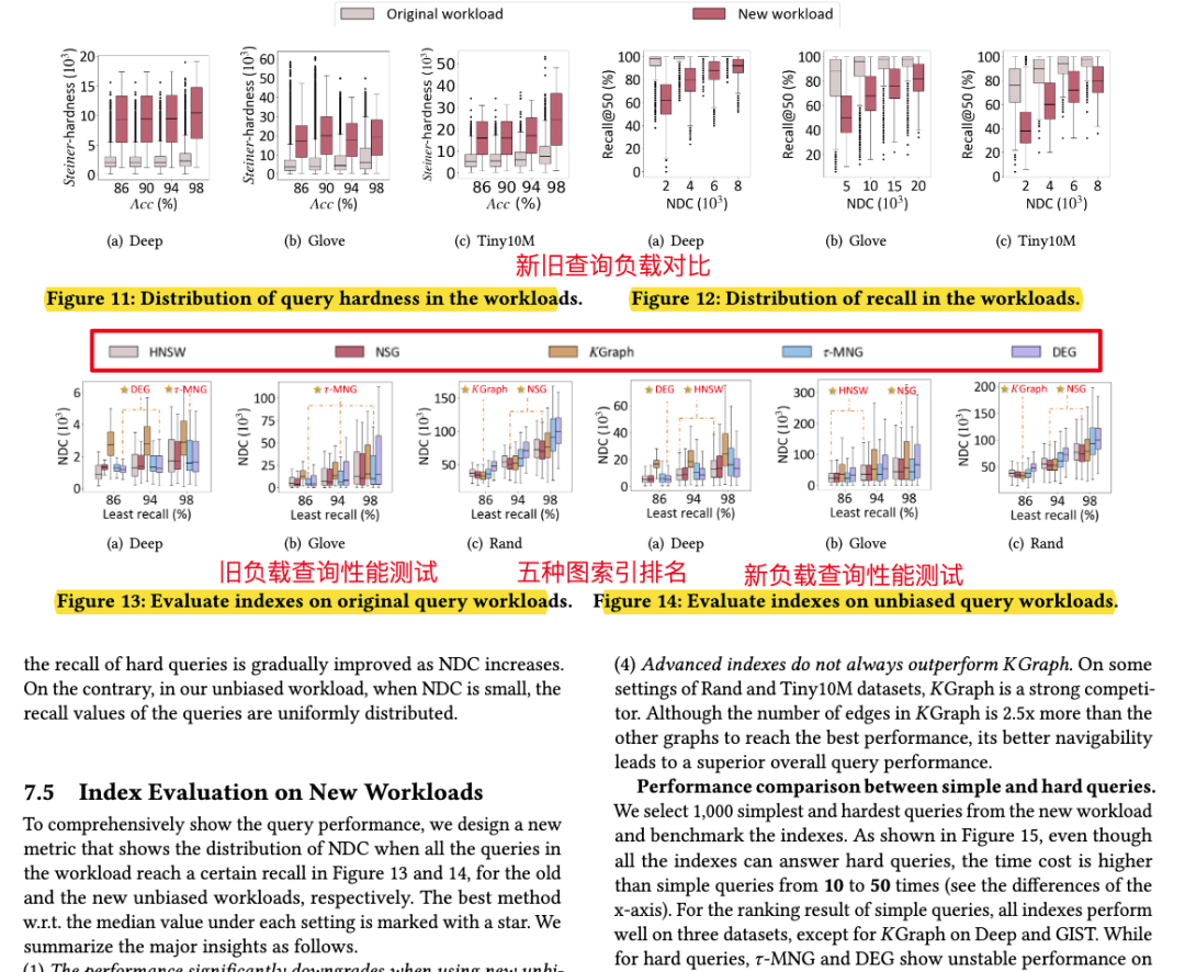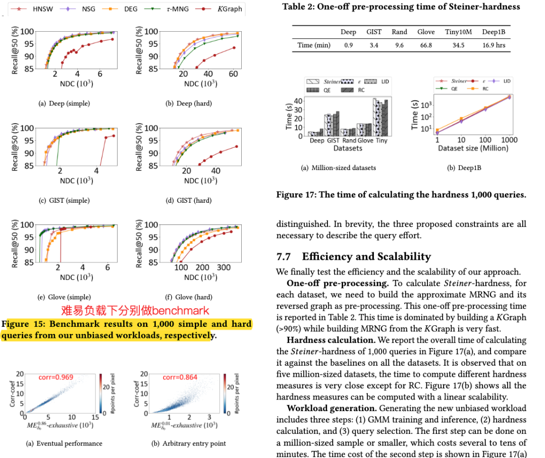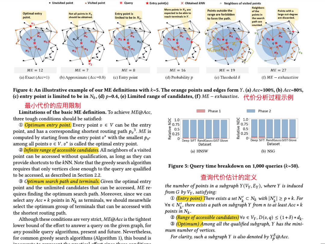 总结 论文在图索引上分析了查询的最小代价,设计了实际查询代价的估计算法,将代价分析问题与经典的斯坦纳树问题联系了起来,并进一步定义了图索引上的查询难度,构造了无偏的压测负载。压测负载上的性能测试显示图索引中HNSW,NSG仍然是最好的索引结构。 代价估计是数据库查询优化中必须的一环,然而在向量数据库中尚无对应算法,其中一个核心难点是同时考虑精度和速度对代价的影响。本文首次在这一问题上做出探索,然而对向量查询优化器的系统研究仍然在起步阶段。 延伸阅读 [1] IS'21:LID作为查询难度的测试 The role of local dimensionality measures in benchmarking nearest neighbor search