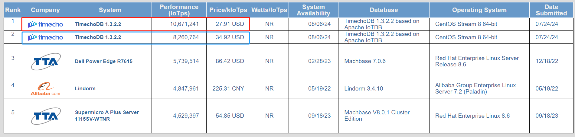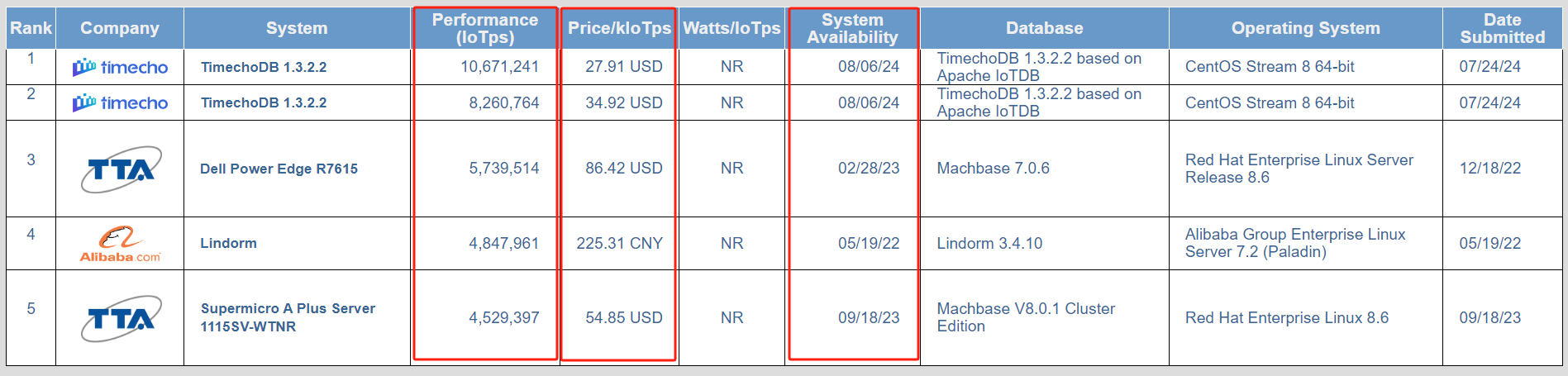 TPCx-IoT 榜单中涵盖了 TimechoDB 两种配置的测试结果。结果可见,TimechoDB 关闭 WAL 情况下排名榜单第一,TimechoDB 开启 WAL 情况下排名榜单第二,两个版本在性能和性价比两个维度上都超过了所有其他系统。