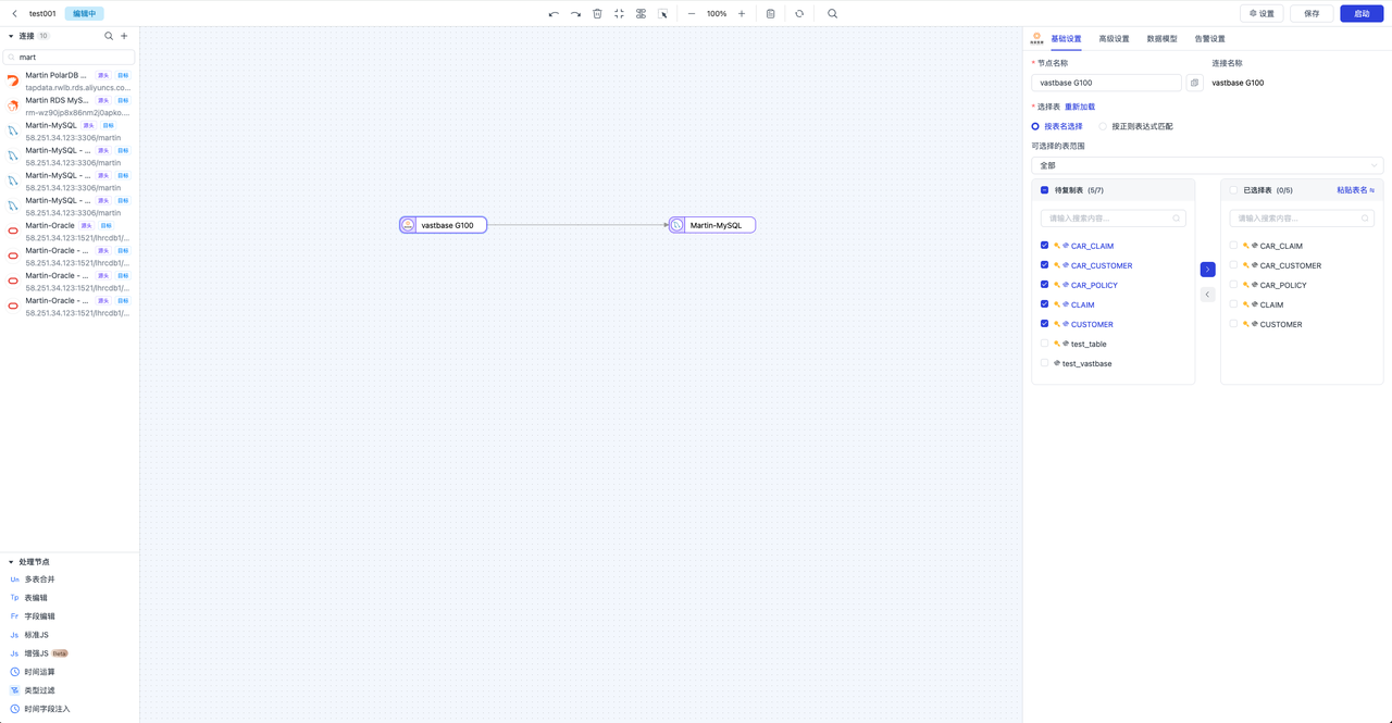 完成 TapData Agent 部署后,即可跟随以下教程在 TapData 中添加 Vastbase 数据连接(支持版本:Vastbase G100 2.2 版本),后续可将其作为源或目标库来构建数据管道。这里我们将以 Vastbase 为数据源,MySQL 为数据目标进行模拟演示。(*涉及工具版本为 TapData 本地部署版)
