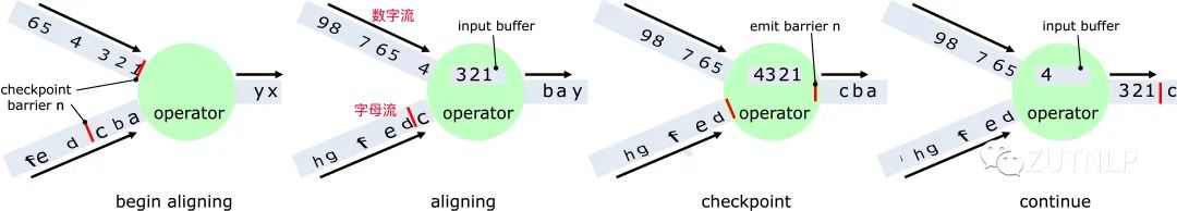首先考虑barrier aligning(对齐)的情况(上图由左至右依次查看),上游的数字流我们称之为数据流和字母流: