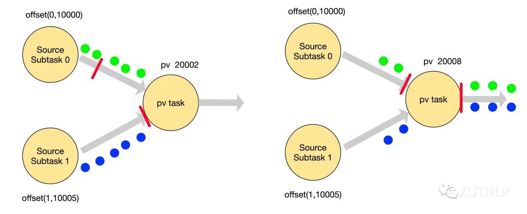 可以看到,Source-Subtask-1 的barrier优先到达pv-task,但是并没有把数据放到input buffer中,而是直接进行处理;等到Source-Subtask-0的barrier到达后,才触发Checkpoint。可以看到pv从20002变为20008。这就是barrier not-aligning。