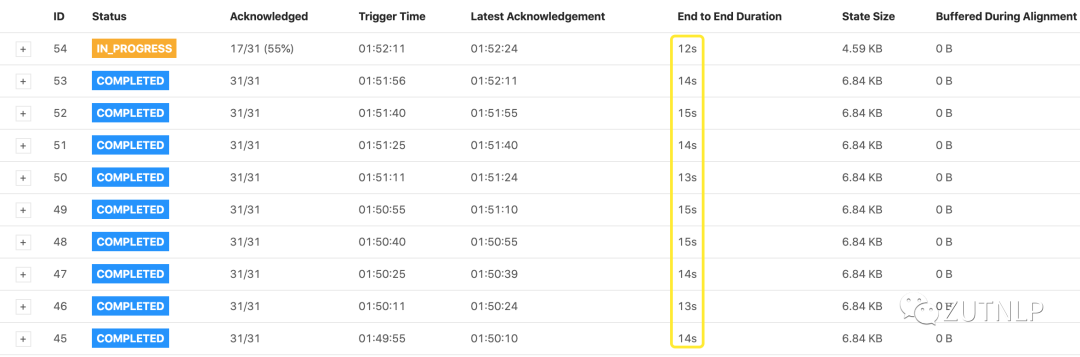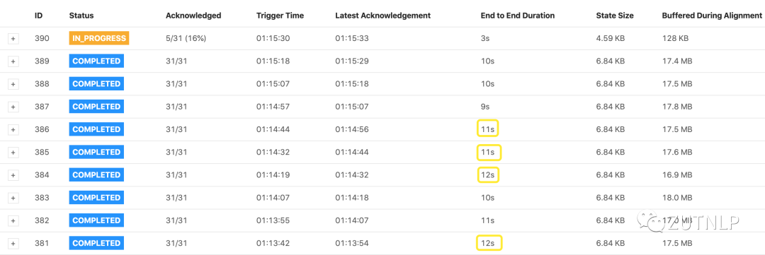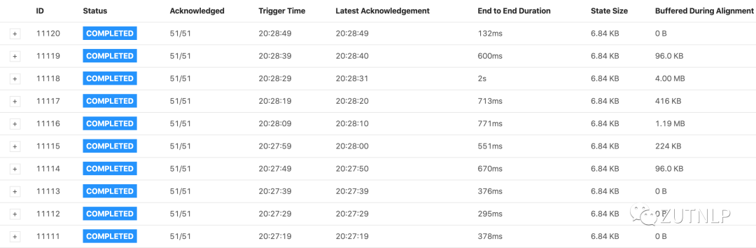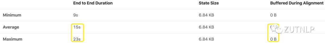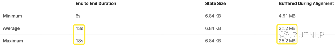Buffered During Alignment: 在所有已确认的子任务aligning期间缓冲的字节数。如果在Checkpoint期间发生aligning,则该值大于零0。如果检查点模式为AT_LEAST_ONCE,则它将始终为零,因为AT_LEAST_ONCE模式下不需要流对齐。