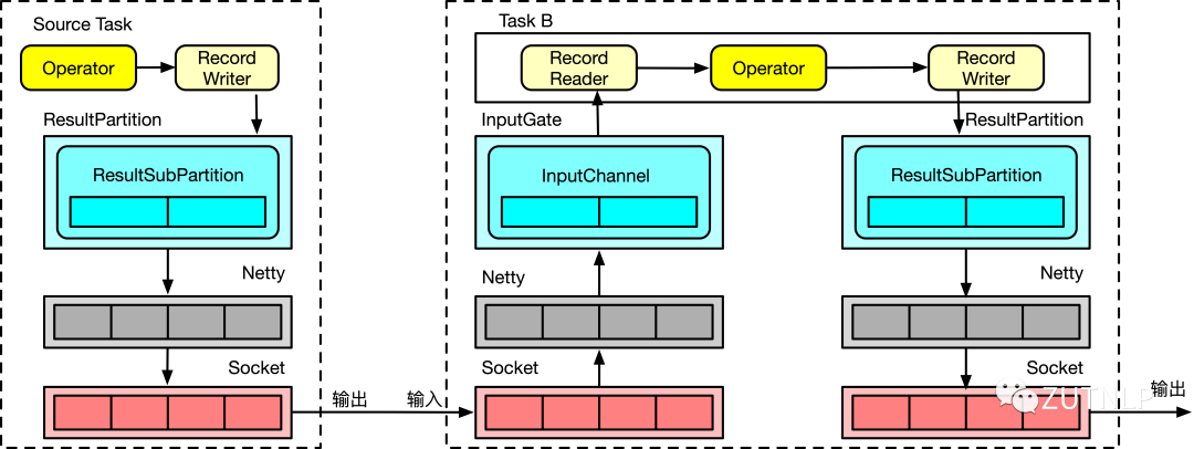 Source Task 给 Task B 发送数据,Source Task 做为 Producer,Task B 做为 Consumer,Producer 端产生的数据最后通过网络发送给 Consumer 端。