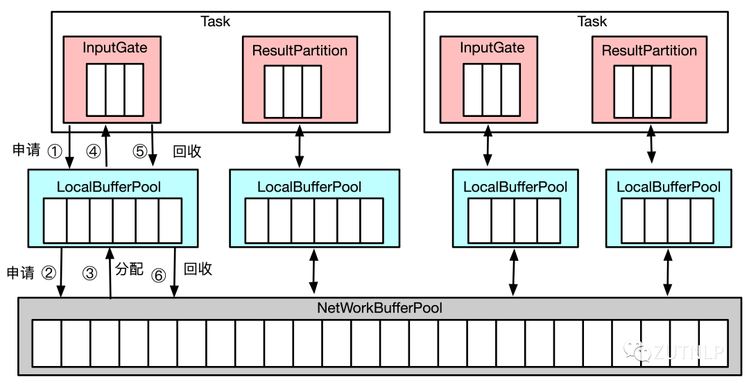 Task 线程启动时,会为 Task 的 InputChannel 和 ResultSubPartition 分别创建一个 LocalBufferPool。InputGate 或 ResultPartition 需要写入数据时,会向相对应的 LocalBufferPool 申请内存(图中①),当 LocalBufferPool 没有足够的内存且还没到达 LocalBufferPool 设置的上限时,就会向 NetworkBufferPool 申请内存(图中②),并将内存分配给相应的 InputChannel 或 ResultSubPartition(图③④)。