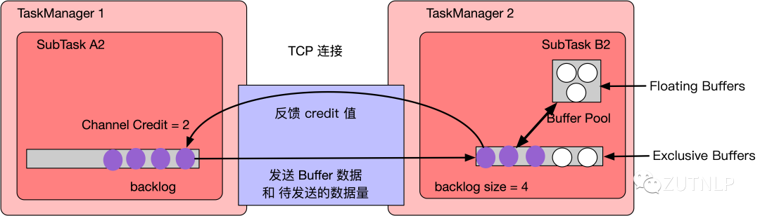 如上图所示,上游 SubTask A2 发送完数据后,还有 4 个 Buffer 被积压,会把要发送的 Buffer 数据和 Backlog size = 4 一块发送给下游 SubTask B2,下游接受到数据后,知道上游积压了 4 个Buffer 的数据,于是向 Buffer Pool 申请 Buffer,申请完成后由于容量有限,下游 InputChannel 目前仅有 2 个 Buffer 空间,所以,SubTask B2 会向上游 SubTask A2 反馈 Channel Credit = 2,上游就知道了下游目前最多只能承载 2 个 Buffer 的数据。所以下一次上游给下游发送数据时,最多只给下游发送 2 个 Buffer 的数据。当下游 SubTask 反压比较严重时,可能就会向上游反馈 Channel Credit = 0,此时上游就知道下游目前对应的 InputChannel 没有可用空间了,所以就不向下游发送数据了。