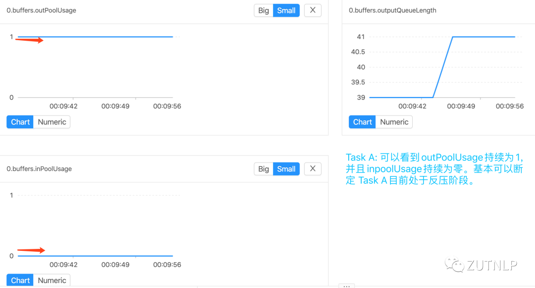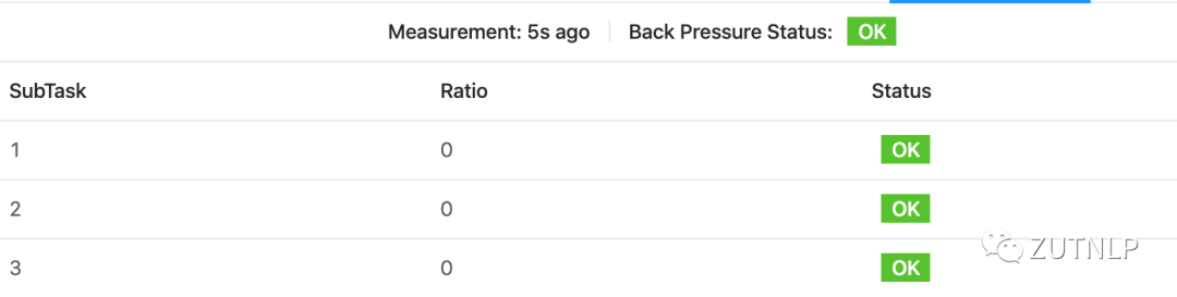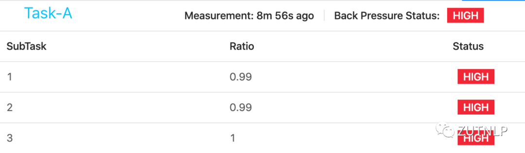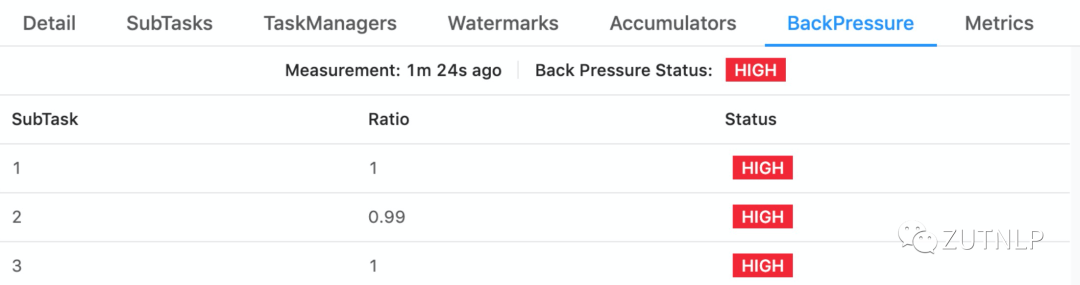 由上图Metrics分析可得出,由于TaskB处理性能受限导致TaskA反压。我们查看BackPressure UI: