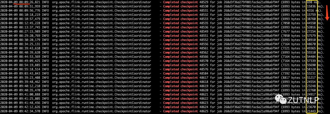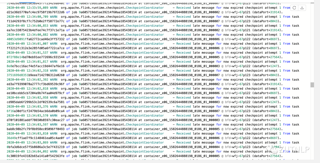 2020-04-09 08:11:59,813 WARN org.apache.flink.runtime.checkpoint.CheckpointCoordinator - Received late message for now expired checkpoint attempt 48534 from task 9aa70b63cbeb6dd9e2f3559002e6706d of job 268d3f36d279f081fac6a21a98a6f94f at container_e06_1582644888198_0182_01_000003 @ bfd-wfj-67p121 (dataPort=13077).2020-04-09 08:12:01,259 WARN org.apache.flink.runtime.checkpoint.CheckpointCoordinator - Received late message for now expired checkpoint attempt 48534 from task 18d35e92a4124e88231720160dc2c52f of job 268d3f36d279f081fac6a21a98a6f94f at container_e06_1582644888198_0182_01_000003 @ bfd-wfj-67p121 (dataPort=13077).2020-04-09 08:12:01,285 WARN org.apache.flink.runtime.checkpoint.CheckpointCoordinator - Received late message for now expired checkpoint attempt 48534 from task 7e0971a4c056df8899d1ad5b1e428075 of job 268d3f36d279f081fac6a21a98a6f94f at container_e06_1582644888198_0182_01_000002 @ bfd-wfj-67p123 (dataPort=6277).2020-04-09 08:12:03,351 WARN org.apache.flink.runtime.checkpoint.CheckpointCoordinator - Received late message for now expired checkpoint attempt 48534 from task c3802c332e99230a020c7ea9ce57ed6e of job 268d3f36d279f081fac6a21a98a6f94f at container_e06_1582644888198_0182_01_000003 @ bfd-wfj-67p121 (dataPort=13077).2020-04-09 08:12:04,383 WARN org.apache.flink.runtime.checkpoint.CheckpointCoordinator - Received late message for now expired checkpoint attempt 48534 from task 831c8afaafa4b1c96e03ba1bd5ff8b36 of job 268d3f36d279f081fac6a21a98a6f94f at container_e06_1582644888198_0182_01_000002 @ bfd-wfj-67p123 (dataPort=6277).2020-04-09 08:12:05,089 WARN org.apache.flink.runtime.checkpoint.CheckpointCoordinator - Received late message for now expired checkpoint attempt 48534 from task 7cc2c8f6250237bc8a5bc483df753f7b of job 268d3f36d279f081fac6a21a98a6f94f at container_e06_1582644888198_0182_01_000004 @ bfd-wfj-67p123 (dataPort=28322).2020-04-09 08:12:05,436 WARN org.apache.flink.runtime.checkpoint.CheckpointCoordinator - Received late message for now expired checkpoint attempt 48534 from task ca819f60686b7787b73ac5ed82bc775c of job 268d3f36d279f081fac6a21a98a6f94f at container_e06_1582644888198_0182_01_000002 @ bfd-wfj-67p123 (dataPort=6277).