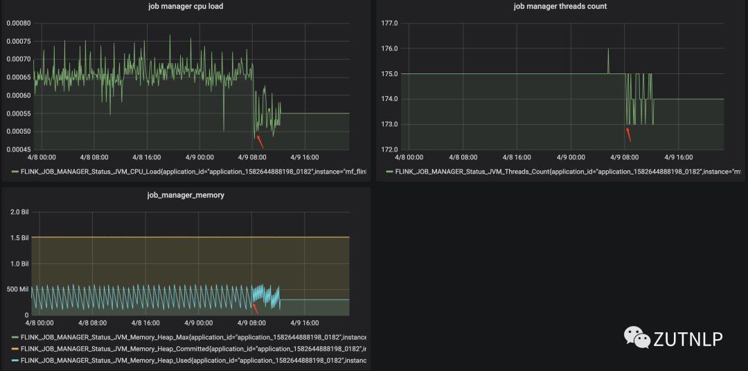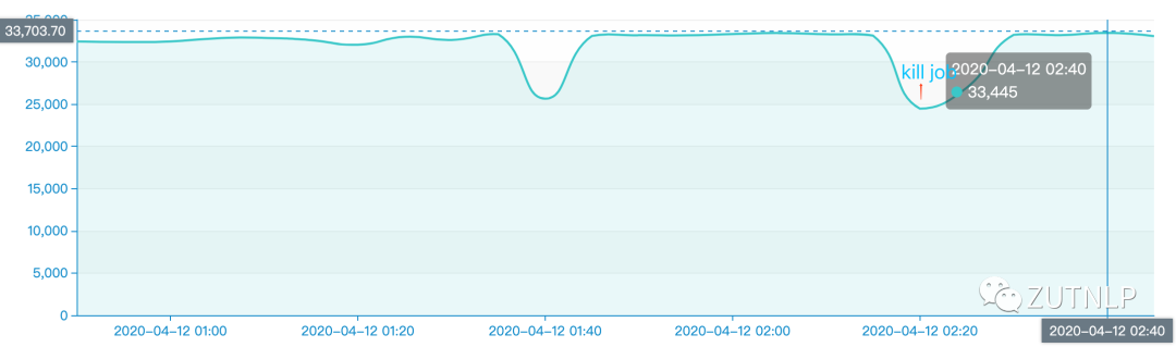 2020-04-09 08:14:03,831 INFO org.apache.kafka.clients.FetchSessionHandler - [Consumer clientId=consumer-4, groupId=mf.streaming.nlp.v1] Error sending fetch request (sessionId=2051621507, epoch=2721109) to node 2: org.apache.kafka.common.errors.DisconnectException.2020-04-09 08:14:05,243 INFO org.apache.kafka.clients.FetchSessionHandler - [Consumer clientId=consumer-3, groupId=mf.streaming.nlp.v1] Error sending fetch request (sessionId=897133184, epoch=2698016) to node 1: org.apache.kafka.common.errors.DisconnectException.2020-04-09 08:16:03,413 INFO org.apache.kafka.clients.FetchSessionHandler - [Consumer clientId=consumer-4, groupId=mf.streaming.nlp.v1] Error sending fetch request (sessionId=706279173, epoch=4) to node 2: org.apache.kafka.common.errors.DisconnectException.2020-04-09 08:16:21,487 INFO org.apache.kafka.clients.FetchSessionHandler - [Consumer clientId=consumer-3, groupId=mf.streaming.nlp.v1] Error sending fetch request (sessionId=306063984, epoch=5) to node 1: org.apache.kafka.common.errors.DisconnectException.2020-04-09 08:17:04,623 INFO org.apache.kafka.clients.FetchSessionHandler - [Consumer clientId=consumer-4, groupId=mf.streaming.nlp.v1] Error sending fetch request (sessionId=1493541258, epoch=1) to node 2: org.apache.kafka.common.errors.DisconnectException.DisconnectException一般表现在Client和Server端未及时通信导致。可以看到发生时刻从08:14:03开始,持续到Job Killed。