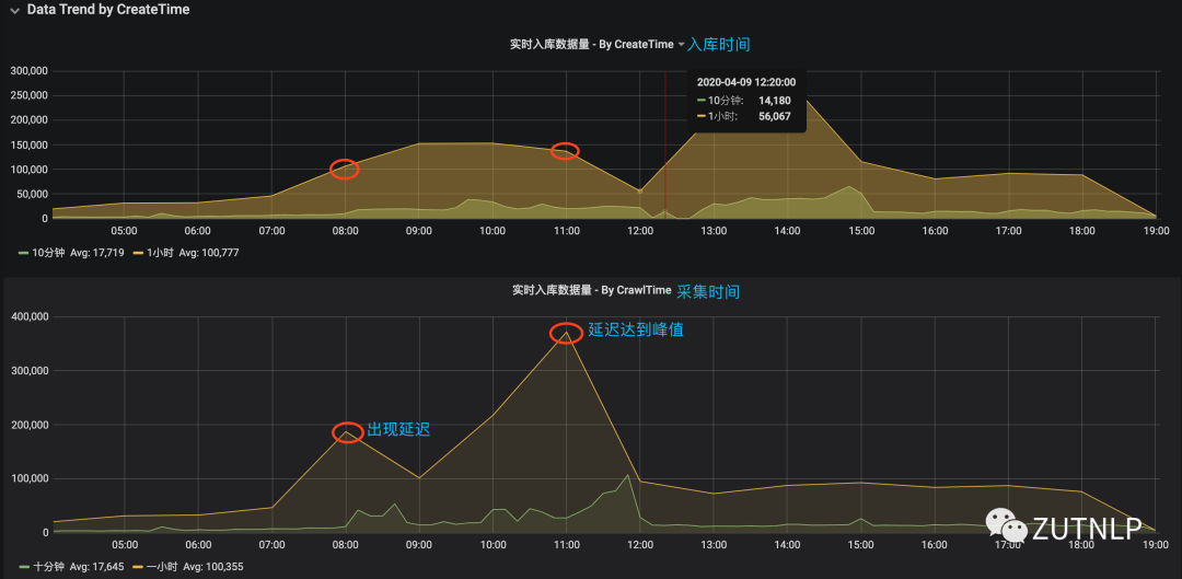 由于目前还没有一个完善的Topic offset和Consumer offset的一个实时对比图,所以无法确定消费延迟是在某时刻进行发生的。但是通过checkpoint和kafka消费信息日志显示,似乎都指向08:10这一时刻。我们借助数据的采集时间和入库时间进行对比分析发现:08:00时刻(08:00~09:00区间段)就已经出现消费延迟。