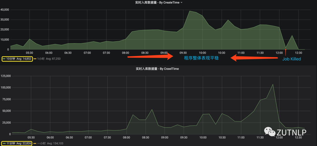 离线统计 07:00 ~ 12:20时间区间,总数据量差额约:34W。这与在Kafka Manager 中查看到的延迟基本吻合。该时间区间内上游推送数据量达95W,消费60W。
