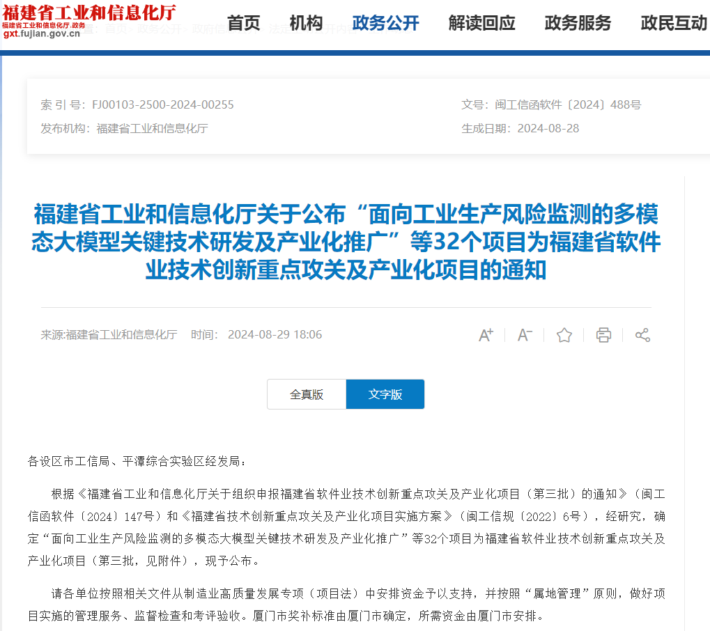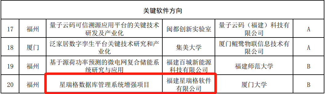 近日,福建省工业和信息化厅网站发布了《福建省工业和信息化厅关于公布“面向工业生产风险监测的多模态大模型关键技术研发及产业化推广”等32个项目为福建省软件业技术创新重点攻关及产业化项目的通知》,福建星瑞格软件有限公司申报的“星瑞格数据库管理系统增强项目”成功入选。