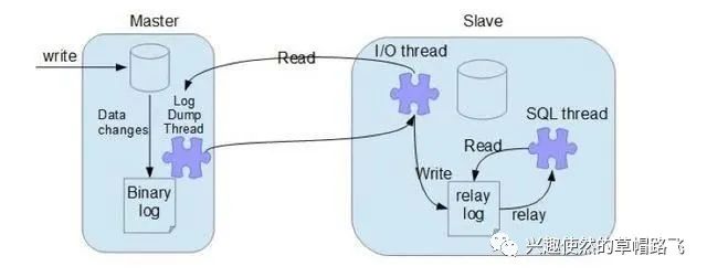 MySQL主从复制涉及到三个线程,一个运行在主节点(Log Dump Thread),其余两个(I/O Thread,SQL Thread)运行在从节点,如下图所示