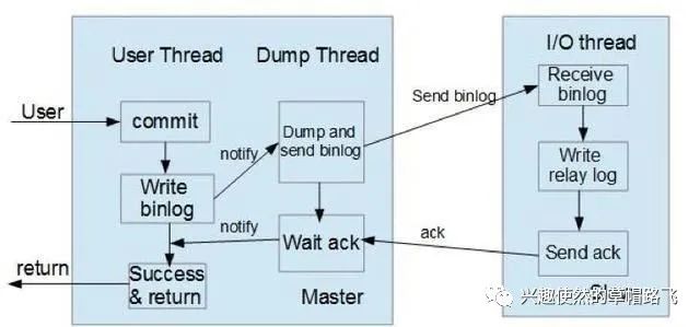 修改语句写入bin log后,不会立即给客户端返回结果。而是首先通过log dump 线程将 binlog 发送给从节点,从节点的 I/O 线程收到 binlog 后,写入到 relay log,然后返回 ACK 给主节点,主节点 收到 ACK 后,再返回给客户端成功。