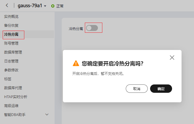 登录管理控制台,在云数据库 GaussDB(for MySQL)的“实例管理”页面,单击目标实例名称,进入基本信息页面。在左侧导航栏,点击“冷热分离”,在“冷热分离”右侧点击