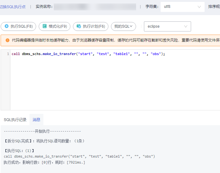 CALL dbms_schs.make_io_transfer("start", "库名", "表名", "分区名", "", "obs");