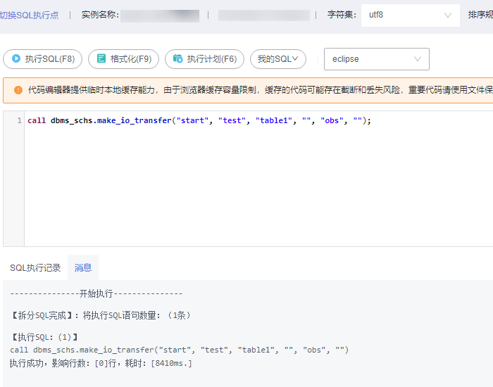 CALL dbms_schs.make_io_transfer("start", "库名", "表名", "分区名", "obs", "");