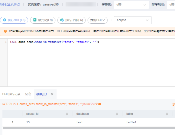 CALL dbms_schs.show_io_transfer("test", "table1", "");