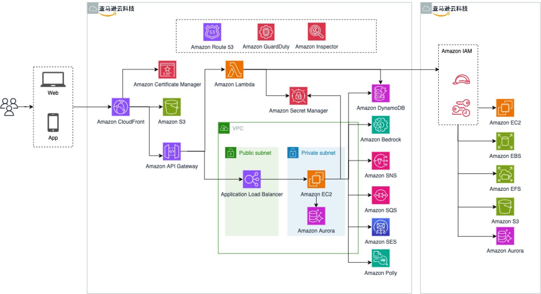 面向日本、美国的用户提供服务时,Notta 目前采用的亚马逊云科技服务包括:Amazon Bedrock、Amazon API Gateway、Amazon Lambda、Amazon Simple Storage Service(Amazon S3)、Amazon CloudFront、Amazon Certificate Manager、Amazon Secrets Manager、Amazon DynamoDB、Amazon Simple Notification Service (Amazon SNS)、Amazon Simple Queue Service(Amazon SQS)、Amazon Simple Email Service(Amazon SES)、Amazon Polly、Application Load Balancer、Amazon Elastic Compute Cloud(Amazon EC2)、Amazon Aurora、Amazon Elastic Block Store(Amazon EBS)、Amazon Elastic File System(Amazon EFS)等。