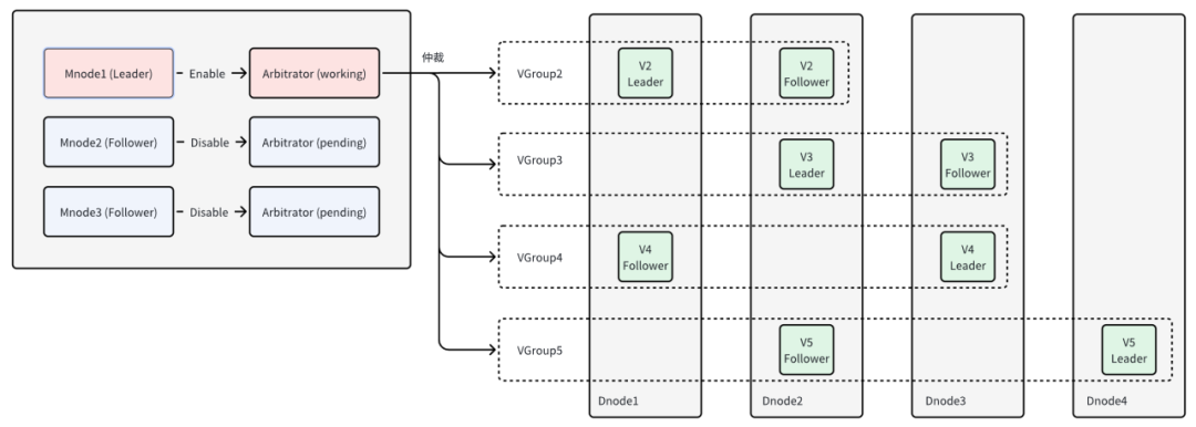 仲裁者 (Arbitrator) 在双副本方案中发挥关键作用。它提供仲裁服务但不存储数据。当 Vgroup 因某一 Vnode 故障而无法提供服务时,Arbitrator 可以根据同步情况指定同组另一 Vnode 成为 Assigned Leader,无论其他副本 Vnode 是否存活,均可一直响应用户请求。这一机制确保了即使在某个副本节点故障的情况下,Assigned Leader 仍然能够一直响应用户请求,从而提高系统的可靠性和可用性。