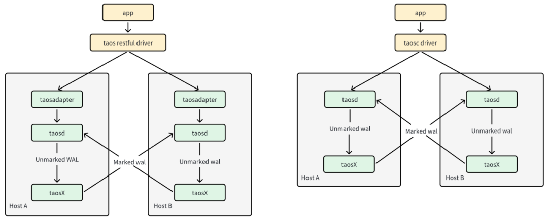 其次,taosX 实现了主节点到从节点的数据复制,通过数据订阅的写接口在写入复制过来的数据时,在 WAL 中加入特殊标记。