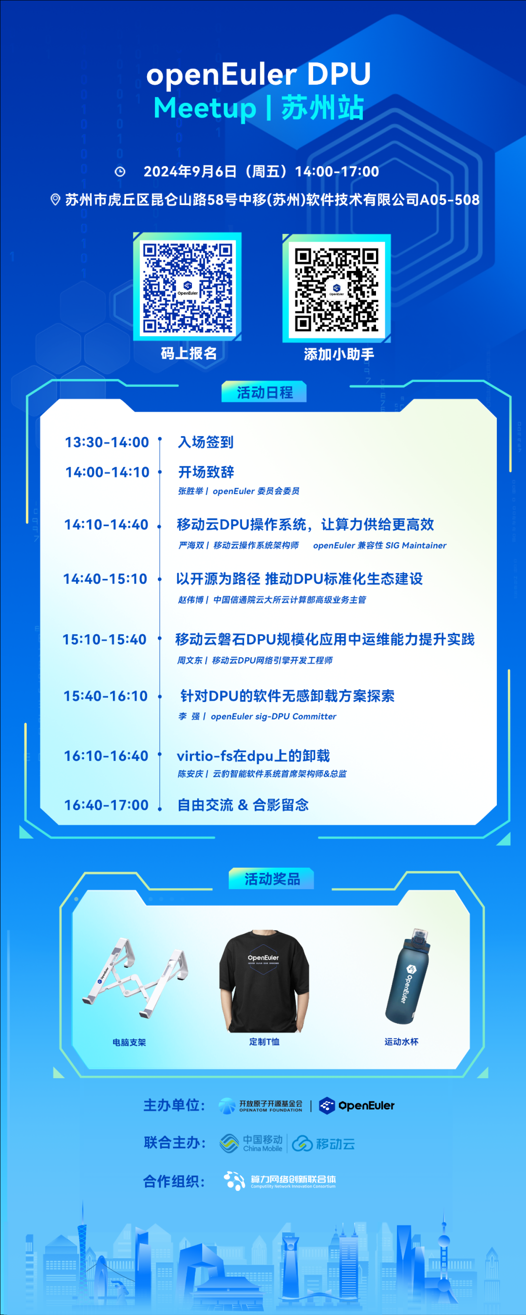 随着云计算、大数据、人工智能等技术的飞速发展,数据处理能力成为衡量云与数据中心性能的关键指标。DPU作为专为数据处理加速设计的计算单元,正逐步成为提升算力供给效率、优化资源利用的关键技术。OpenAtom openEuler(简称"openEuler")社区将于 9月6日在苏州举办一场DPU Meetup,欢迎大家报名。本次Meetup旨在汇聚行业精英,共同探讨DPU技术的最新进展、应用实践及未来趋势。参会者将有机会聆听来自中国移动、信通院、云豹、华为等企业的专家分享DPU技术的最新动态与前沿趋势,同时与同行交流心得,拓展人脉资源。