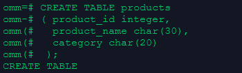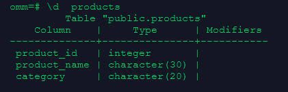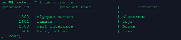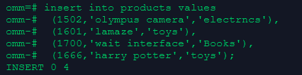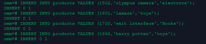 INSERT INTO products VALUES (1502,'olympus camera','electrncs');