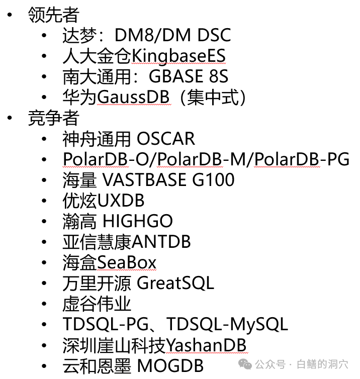 上图是从2024年的报告中,排在领航者象限的其实还是中国数据库“老四家 ”,“老四家”是和高校中的985一样没有争议的,是十多年前中国数据库市场上的先行者,其中成立最晚的神州通用也是2008年成立的专业数据库公司,而人大金仓的成立时间已经是上个世纪的事情了(1999年)。老四家虽然无争议,如果放在几年前,我也是认可的。不过如果放到了2024年的今天,恐怕无论在技术、知名度、市场规模、用户群体、用户认可度等多个方面,恐怕也不足以服众。