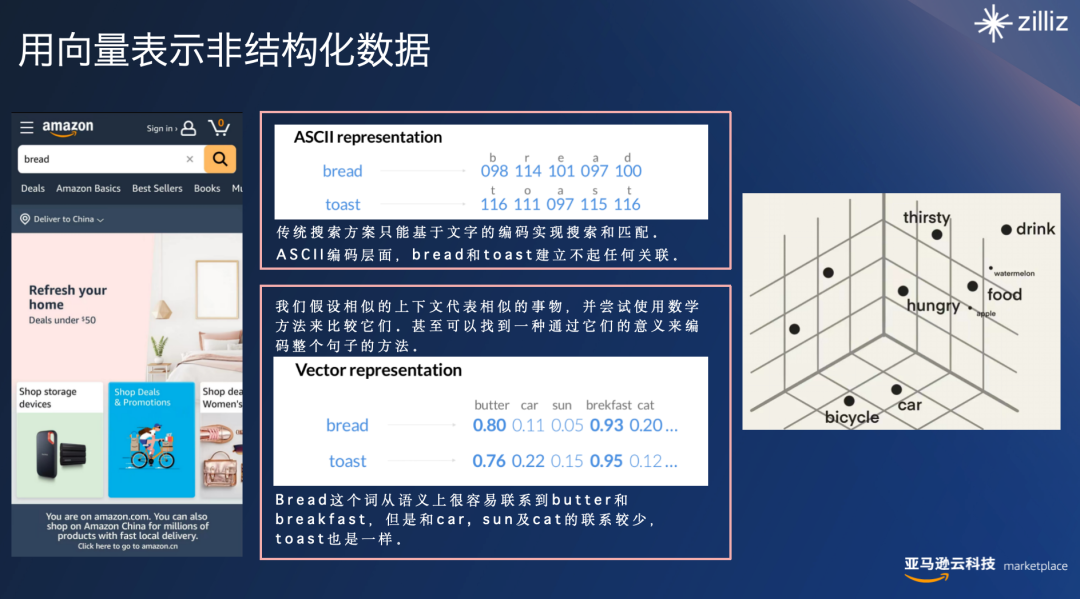 比如,用户在电商场景中搜索面包,如果仅以关键词维度进行搜索,那么吐司、贝果、欧包、慕斯等面包的细分品类,就可能会被忽略。但在语义与向量维度,它们之间具备极高的相似度,以此为依据,进行搜索结果返回,更符合现实场景中的用户需求。