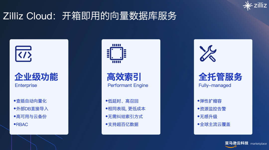 相比开源产品,Zilliz Cloud具备三大特性:全托管服务、高效索引、企业级功能。