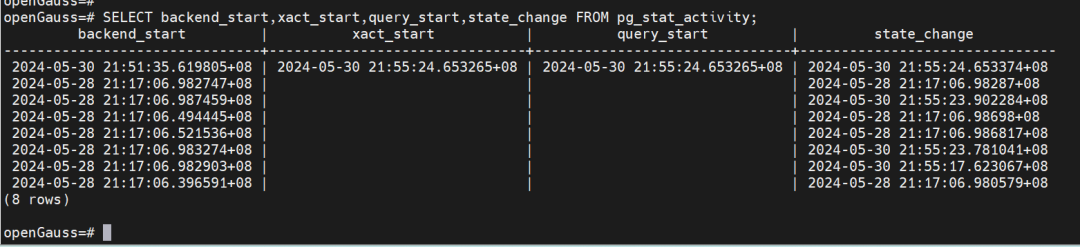 openGauss=# SELECT backend_start,xact_start,query_start,state_change FROM pg_stat_activity;