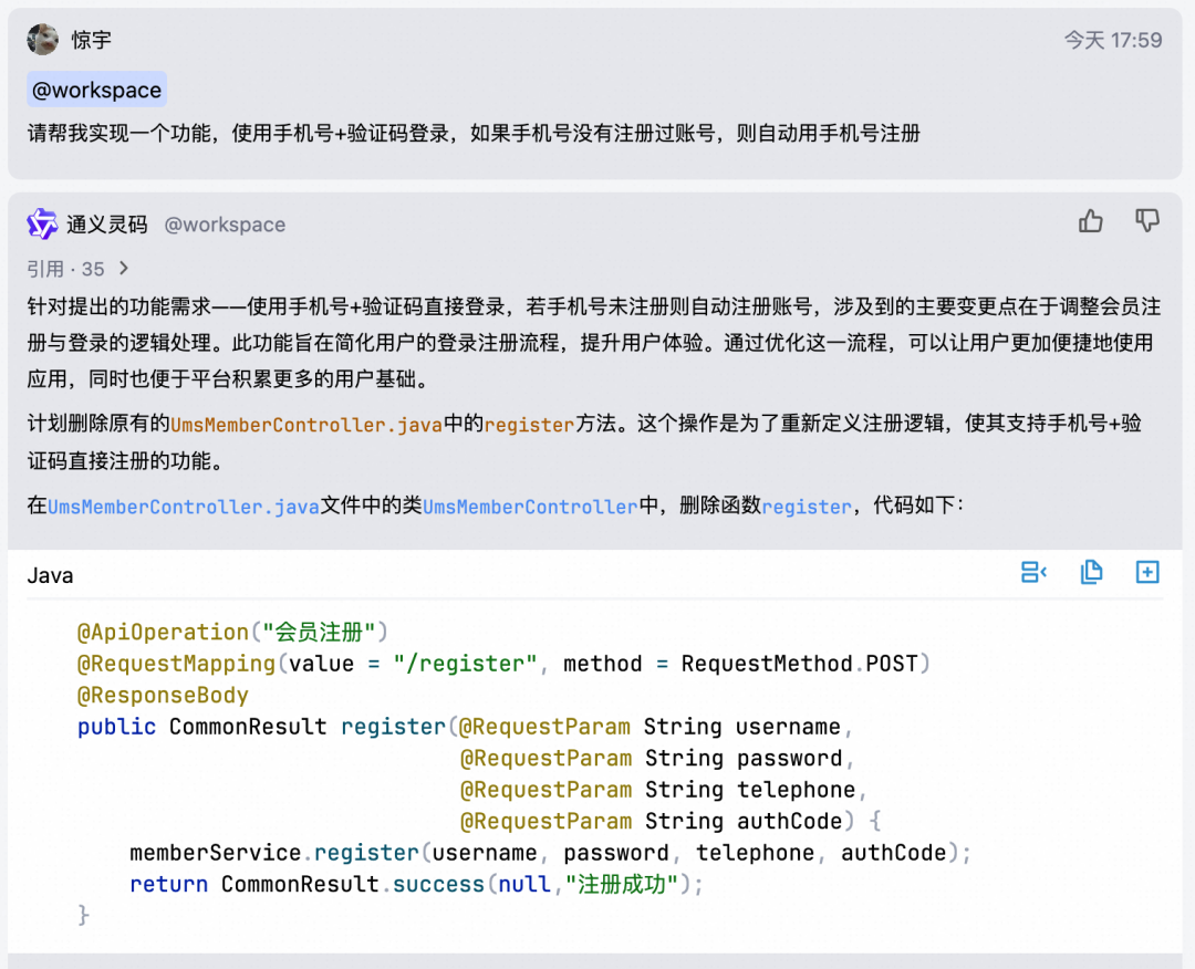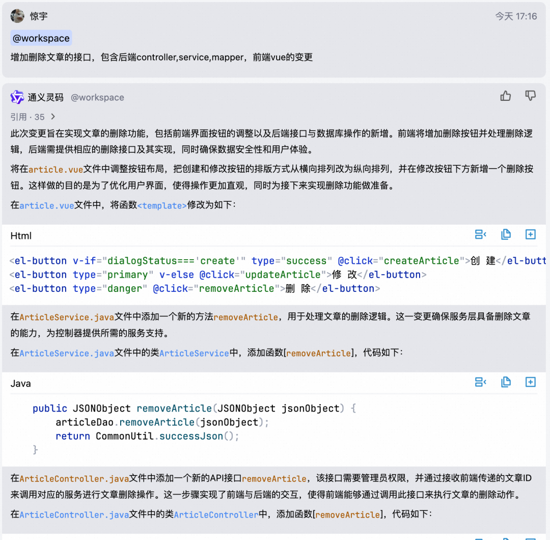 可以结合当前代码工程,分析用户的需求问题,提供实现代码或头脑风暴。如“如何增加用户鉴权逻辑”,“实现一个功能,批量添加我的收藏里的商品到购物车”,“增加删除文章的接口,包含后端 controller,service,mapper,前端 vue 的变更”等等,让灵码快速提供解决方案及代码。