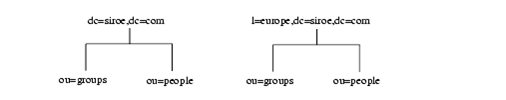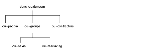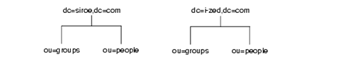 目录中可能包含多个根后缀。例如,一个 ISP 可能为多个 Web 站点提供主机服务:一个为 siroe.com,而另一个则为 I-zed.com。ISP 将创建两个根后缀,分别对应于 dc= siroe,dc=com 命名环境和 dc= I-zed,dc=com 命名环境。如下所示,目录树显示为: