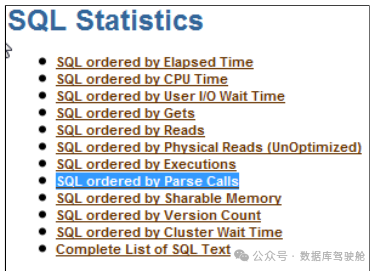 然后,在SQL Statistics下点击'SQL ordered by Parse Calls'和'SQL ordered by Version Count'查看信息: