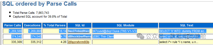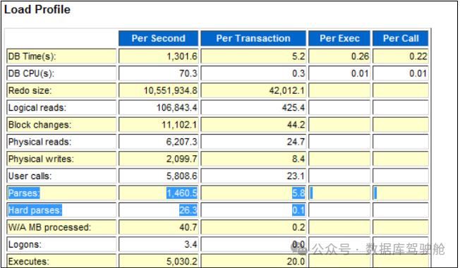 这表明每秒26.3次硬解析,表示硬解析频率高。检查应用程序是否共享SQL。