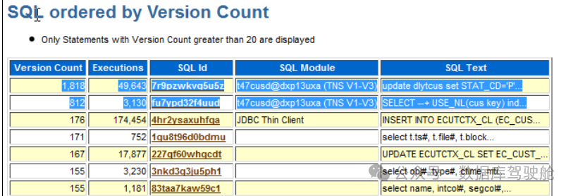 接下来,检查SQL的版本计数: 从列表中调查高版本计数的SQL。这些语句为何不能共享?是否可以解决此问题?