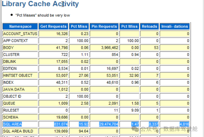 「在Library Cache活动下检查无效化」。如果无效化次数高,则检查期间执行的DDL操作,如截断、删除、授予、dbms_stats等。