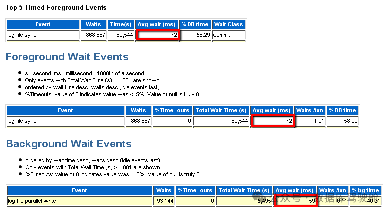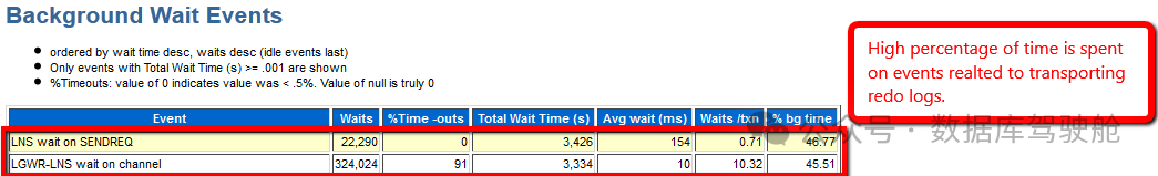 「其他可能相关的等待事件」 检查 AWR 报告,看看是否有其他与 LGWR 相关的事件也显示占用了大量时间,这可能为找出问题原因提供线索。应检查前台和后台事件。例如,以下 AWR 显示其他前台和后台等待事件等待时间较长,这可能实际表明将重做日志传输到远程位置存在问题,导致前台进程等待“log file sync”。