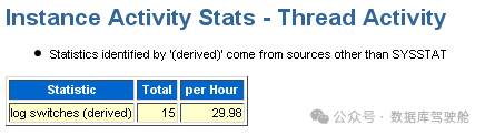 以上例子显示日志切换每 2 到 4 分钟发生一次,频率比推荐的高 5 倍以上。您还可以检查 AWR 报告中的日志切换平均时间。